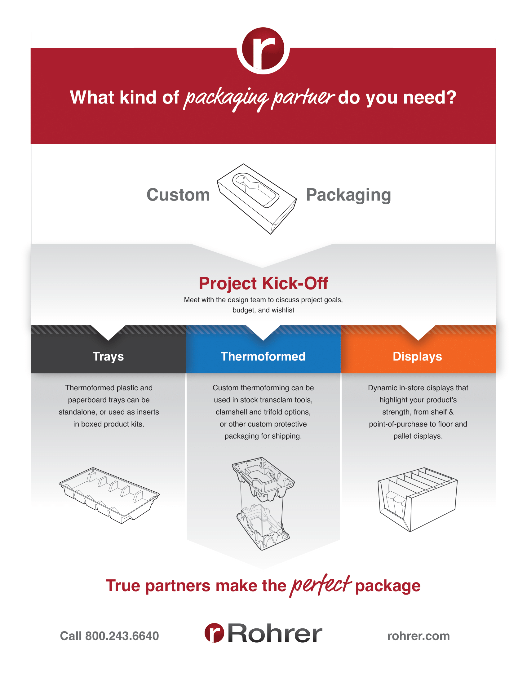 A great product deserves unique packaging. Rohrer’s partners prefer custom packaging to differentiate their product from their competition. Custom packaging allows for creative designs with unique shapes, sizes, and textures. Our expert designers can use special draft angles and or undercuts that provide a functional package to “wow” the consumer. Custom thermoforming gives us a chance to stretch our creativity, and we love collaborating with our partners to create innovative packaging solutions. We will design and manufacture clamshells, trays, displays, and much more.